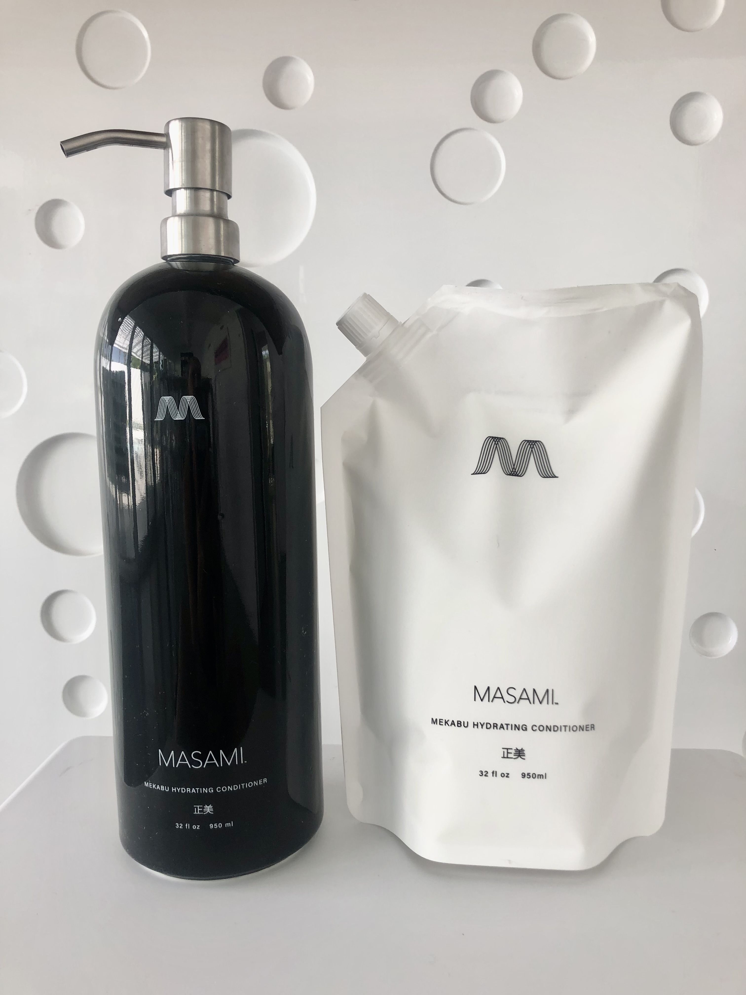 The MASAMI 32 oz Refillable, Sustainable Bottle is here! It's a gorgeous black ceramic bottle with a stainless steel pump, designed to elevate any bathroom and last a lifetime. It comes with a 32 ounce recyclable pouch filled with our high-performing luxurious Mekabu Hydrating Conditioner.