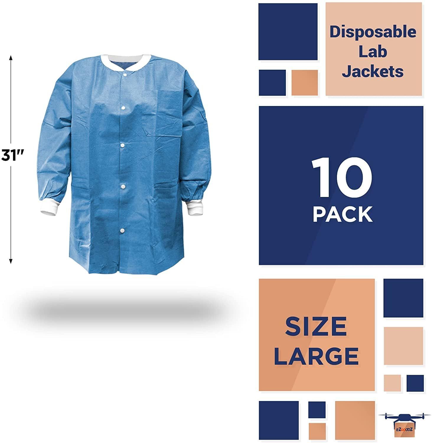 1.Pack of 10 disposable lab jackets for adults. Large ceil blue disposable jackets are 31 inches long. Unisex adult lab coat provides maximum comfort and excellent protection for the body and clothing during work.