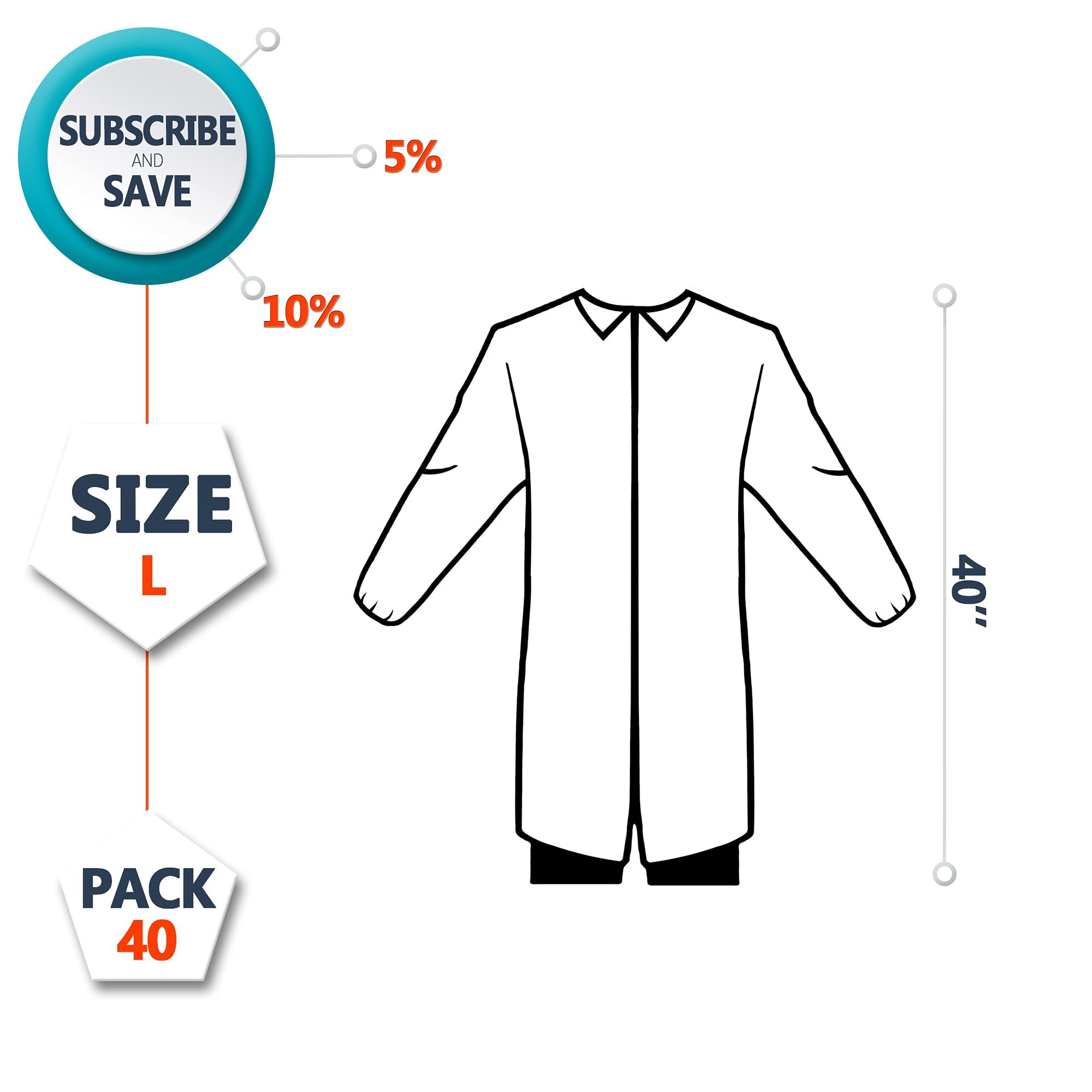 1.PACK OF 40 DISPOSABLE LAB COAT L-SIZE 40'' LONG. Knee length lab coat are designed to save clothes from water and other liquids. Medical robes for men and women are equipped with snaps, elastic cuffs, and convenient hook and loop fasteners for quick closure.