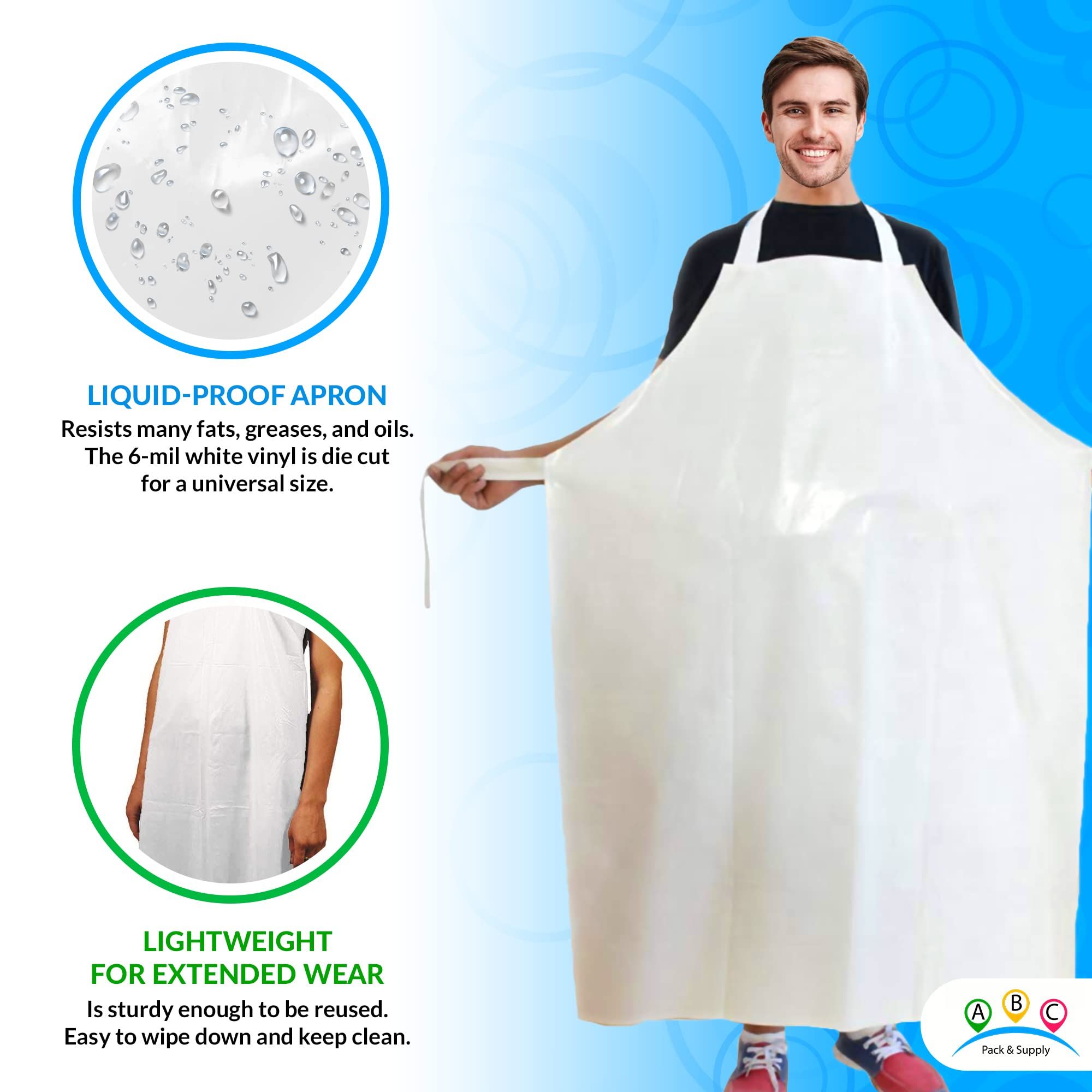 1.PACK OF 72 WHITE DISPOSABLE APRONS FOR ADULTS 35x45: Waterproof vinyl apron is designed to prevent liquids from seeping through to your clothing. Disposable adult aprons are resistant to many fats, greases and oils.