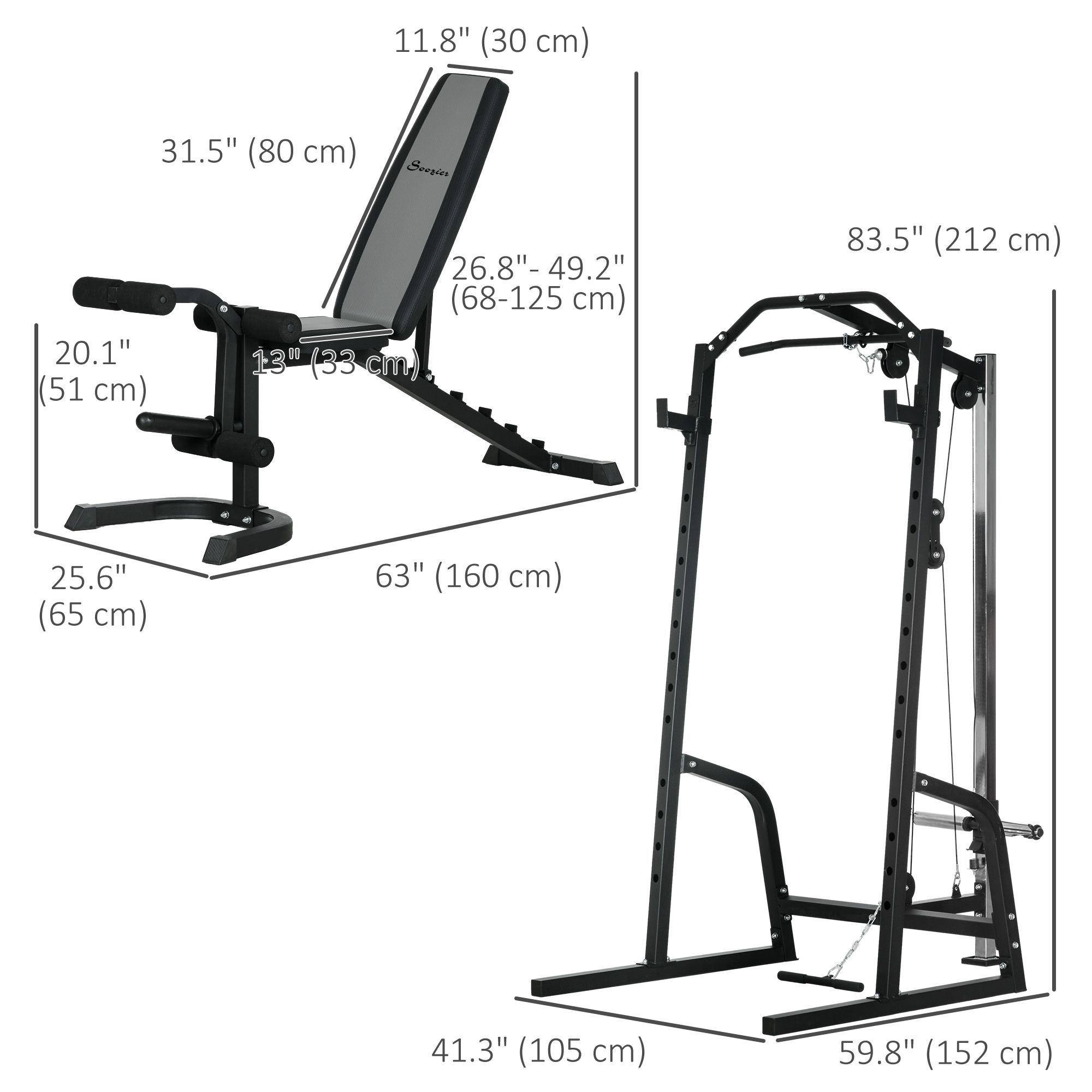 • Power Tower Info: Weight frame dimensions: 59.8" L x 41.3" W x 83.5" H (152 x 105 x 212 cm). Fitness bench dimensions: 63" L x 25.6" W x 26.8-49.2" H (160 x 65 x 68-125 cm). Maximum user weight: 264 lbs. (120 kg). Assembly required.