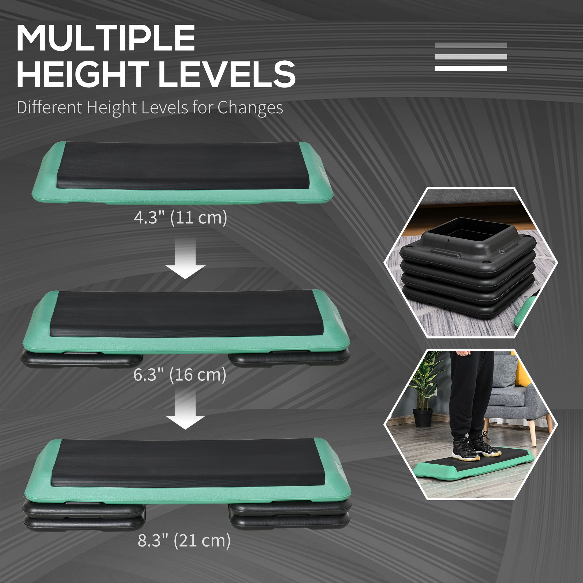 • Adjustable Height: The aerobic stepper comes with four platforms to adjust the stepping level - using risers to challenge yourself and burn more calories!