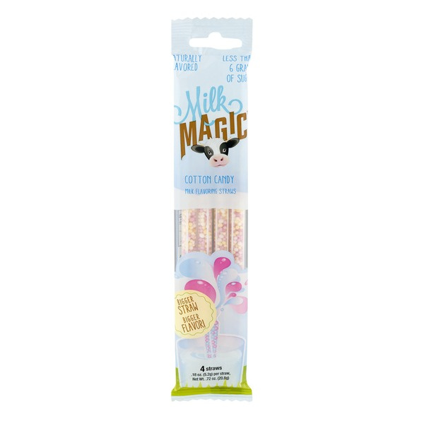 Milk Magic Cotton Candy Flavored Straws make drinking milk a fun and tasty experience for kids and adults alike. Just dip and sip – the flavor beads inside the straw transform plain milk into a sweet cotton candy delight without the mess of powders or syrups.