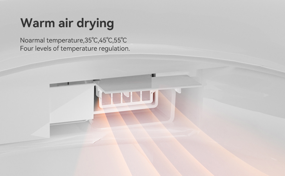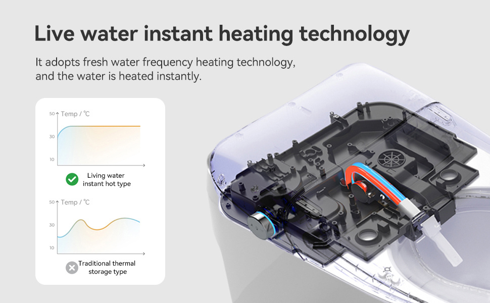 Designed for comfort and convenience, our smart toilet offers instant warm water, warm air drying, night light, heated seat, LED display, seat temperature adjustment, auto flush, remote control, enhancing the overall user experience.