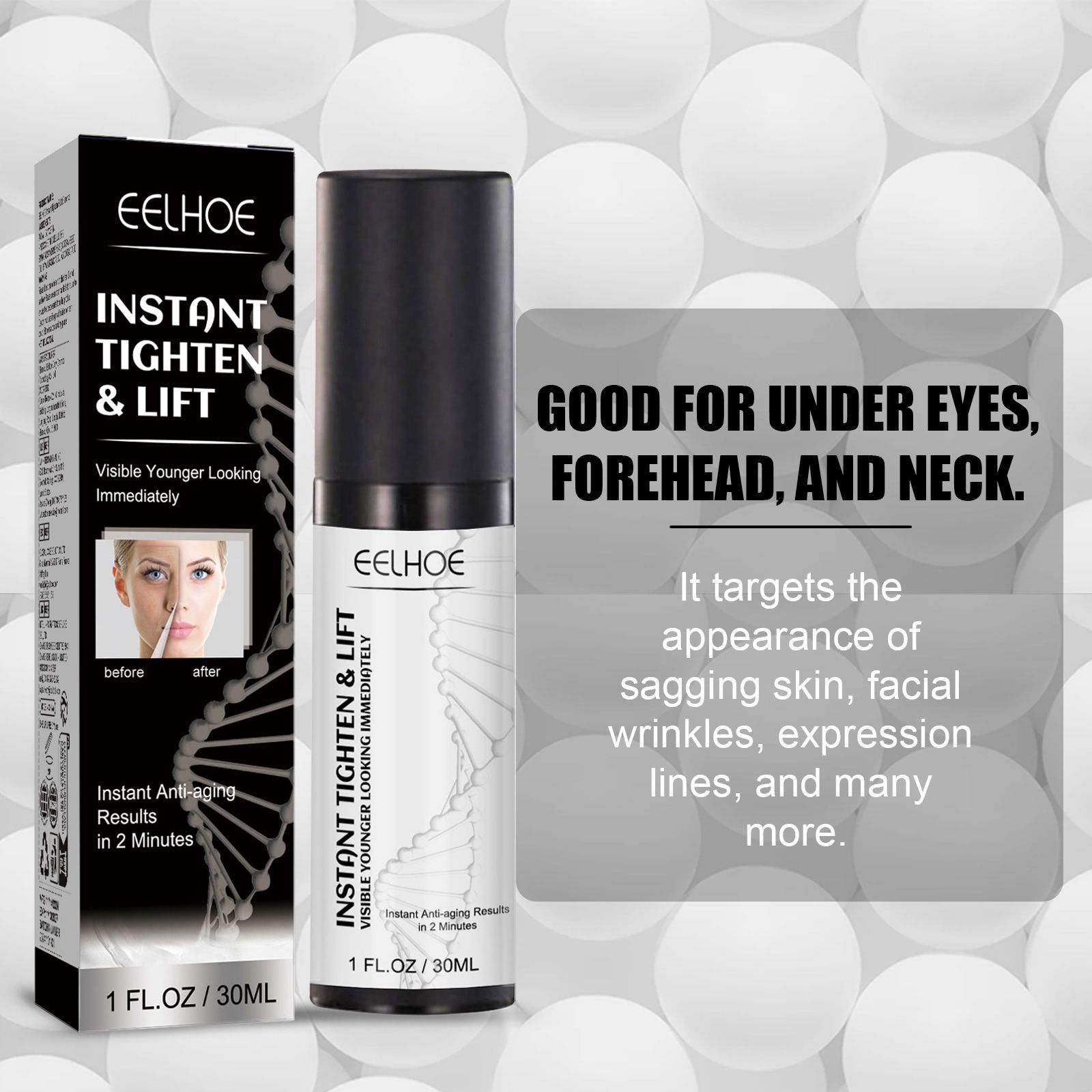 Our Face Instant Firming Lift Essence contains hyaluronic acid, vitamin C. It can make expression lines less noticeable, the appearance of wrinkles and bags under the eyes, eliminate fine lines around the mouth, cheeks and chin, and the appearance of your neck and chest. Its application is simple: first, thoroughly clean and dry the skin. Makeup, sweat and oil will the effect, again gently press the pump, starting at half the size of the pea, apply a small amount of essence to the fingertips, then apply a thin, even layer to the target area, avoiding contact with the eyes, then do not make any facial expressions for 4. 2 minutes, let the cream do its work to solidize and dry, and finally after drying, you will feel the skin start to tighten. This is a normal phenomenon and the effects can last up to 12 hours. And can immediately the appearance of wrinkles and fine lines, lasting up to 12 hours.